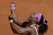 Serena Williams of the U.S. celebrates winning the final of the French Open tennis tournament against Lucie Safarova of the Czech Republic in three sets, 6-3, 6-7, 6-2, at the Roland Garros stadium, in Paris